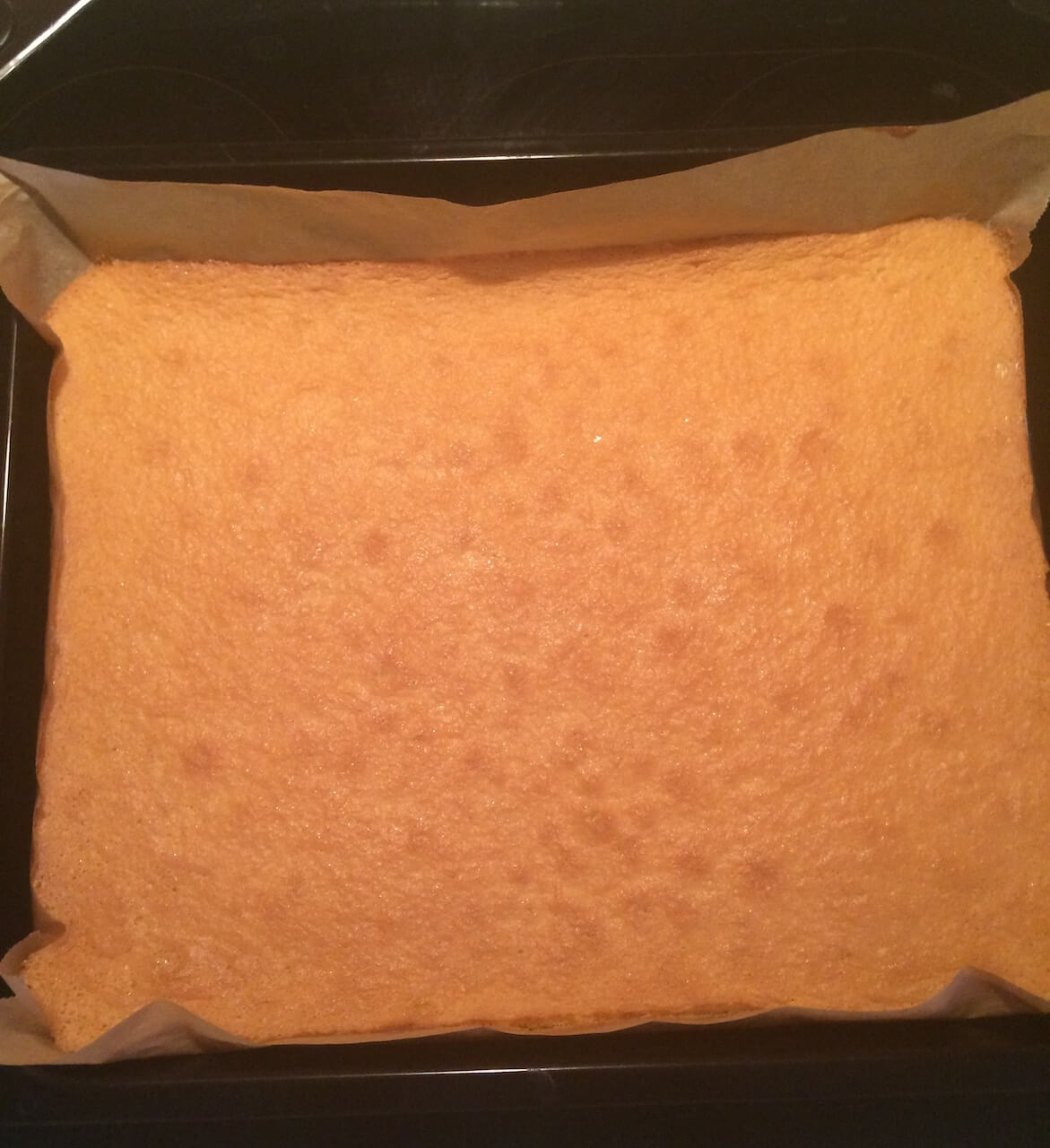 Az egész tojásokat és a vaniliáscukrot a legmagasabb fokozaton a robotgépen habbá verjük, majd a legalacsonyabb fokozaton lassan belekeverjük a sütőporral elkevert lisztet és a sütőpapírral kibélelt tepsibe simítjuk. 200°C-ra előmelegített sütőbe tesszük középre kb. 10 percre.