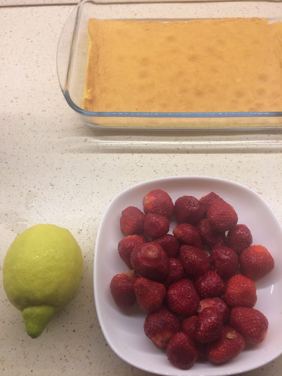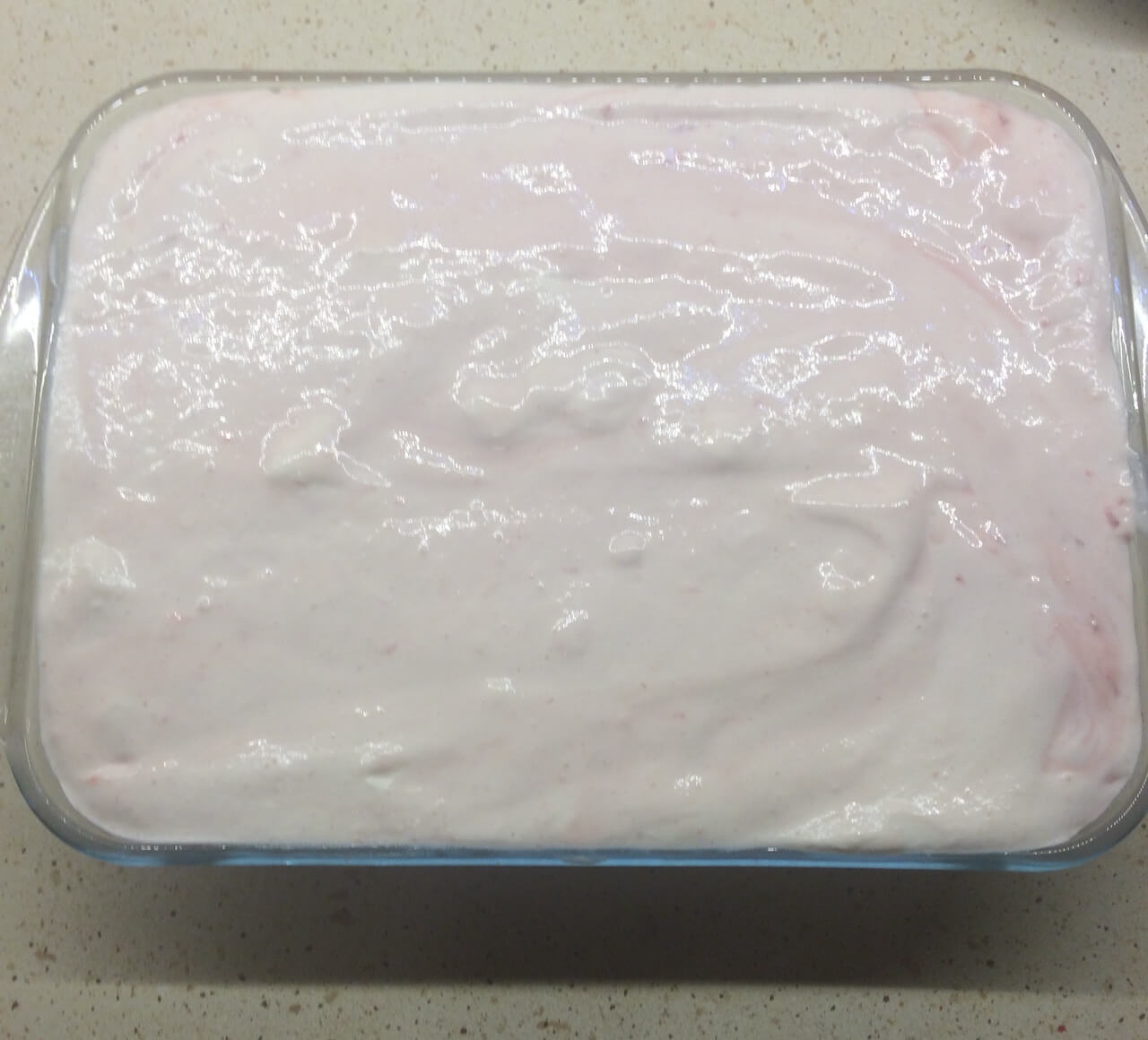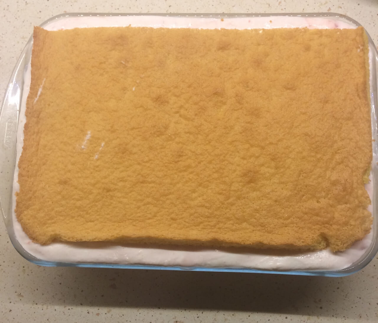 Beleöntjük a krémbe és gyorsan elkeverjük, majd a keményre felvert tejszínt beleforgatjuk az epres krémbe. Beletesszük a fél piskótát egy tálba, beleöntjük a krémet és beborítjuk a másik piskótával. Egy éjszakára hűtőbe tesszük.