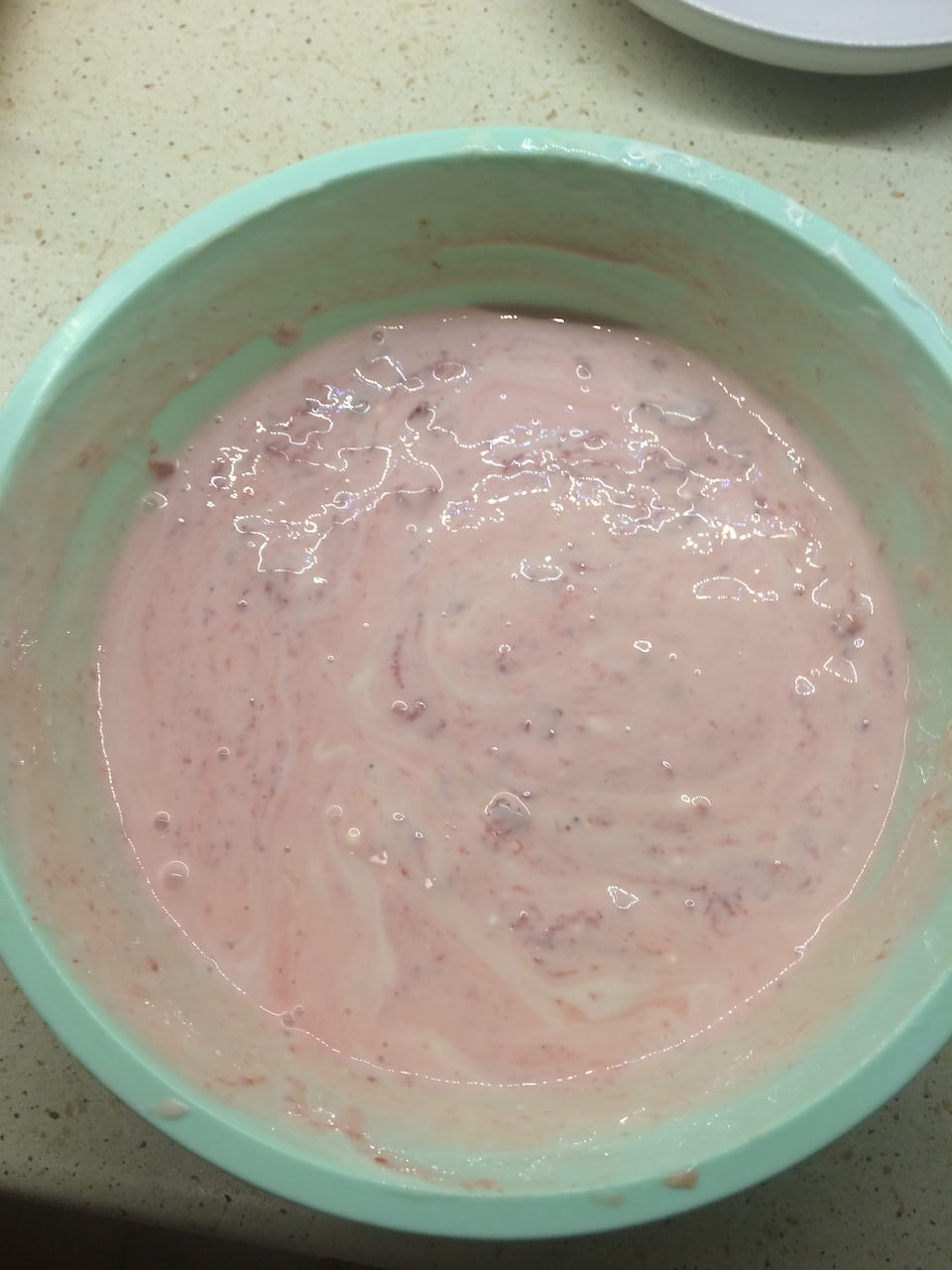 A 6 lap zselatint beáztatjuk hideg vizbe egy kis tálba. Nagyobb tálba beletesszük a tejfölt és a porcukorral és vaniliás cukorral kikeverjük simára, beletesszük az epres joghurtot és elkeverjük.