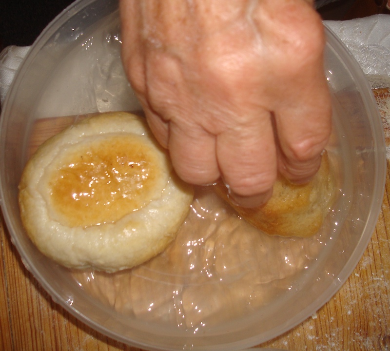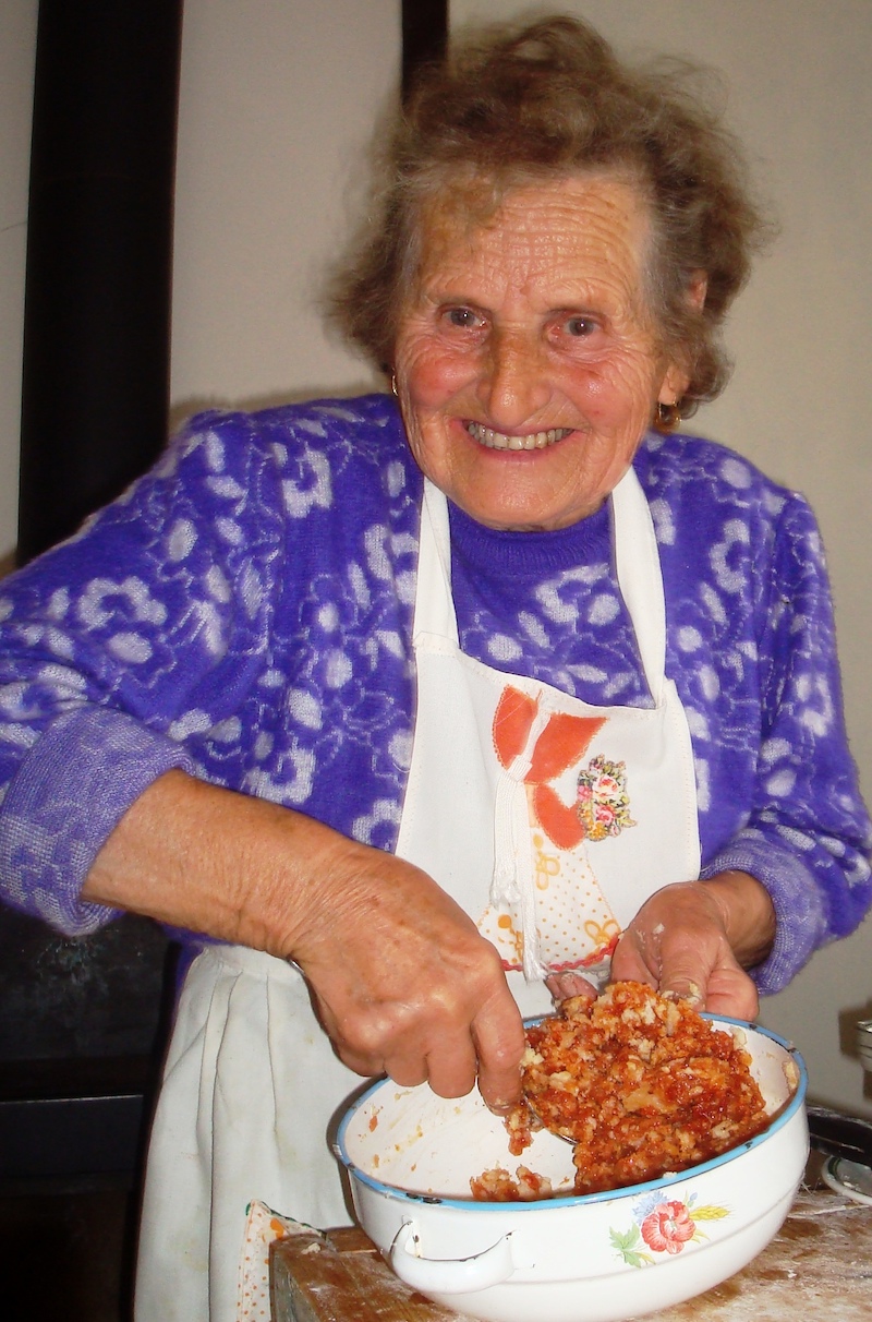 A húshoz két egész tojást teszünk, beletörjük a zsemlét és kenyeret, a közepét, ami nem ázott át, belereszeljük. Kanállal jól elegyítjük a masszát. Vizes kézzel golyókat formálunk, ezeket kevés, liszttel kevert zsemlemorzsával megszórjuk, még egyszer átgömbölygetjük.