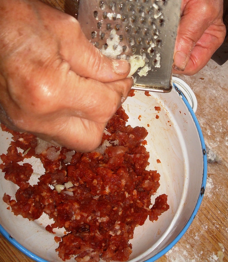 A darált húst ízlés szerint sóval, borssal, paprikával ízesítjük, összekeverjük. A hagymát és a fokhagymát hozzáreszeljük. A száraz zsemléket és kenyeret rövid időre hideg vízbe tesszük, hogy megszívják magukat.