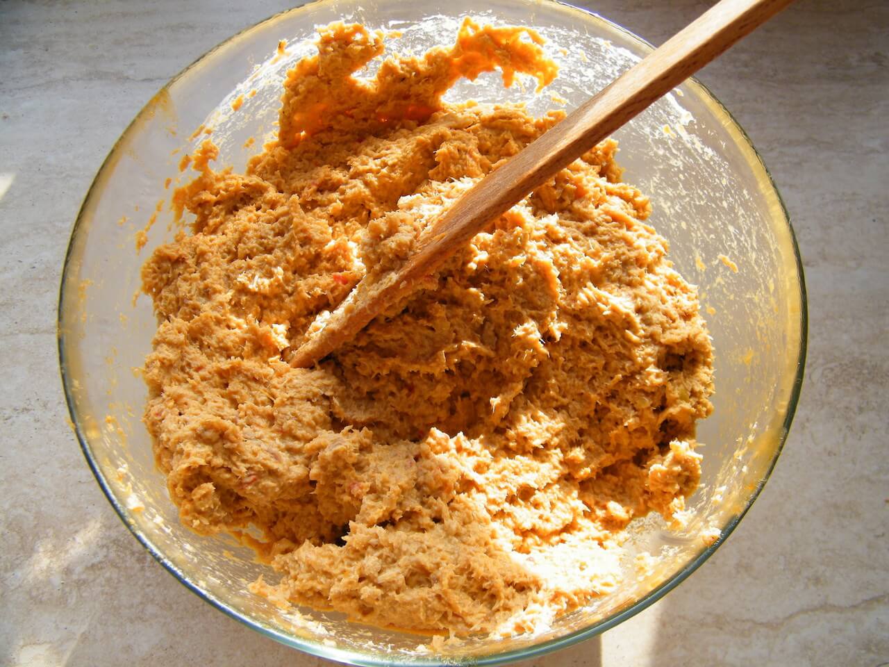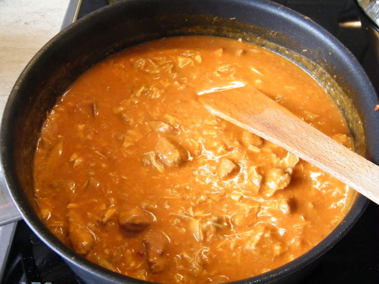 Ha elkészült a pörkölt, kiszedjük a húst a levéből és ledaráljuk. A pörkölt levével összekeverünk 3 dl tejfölt és ebből annyit adunk a darált húshoz, hogy könnyen kenhető töltelékmassza legyen.