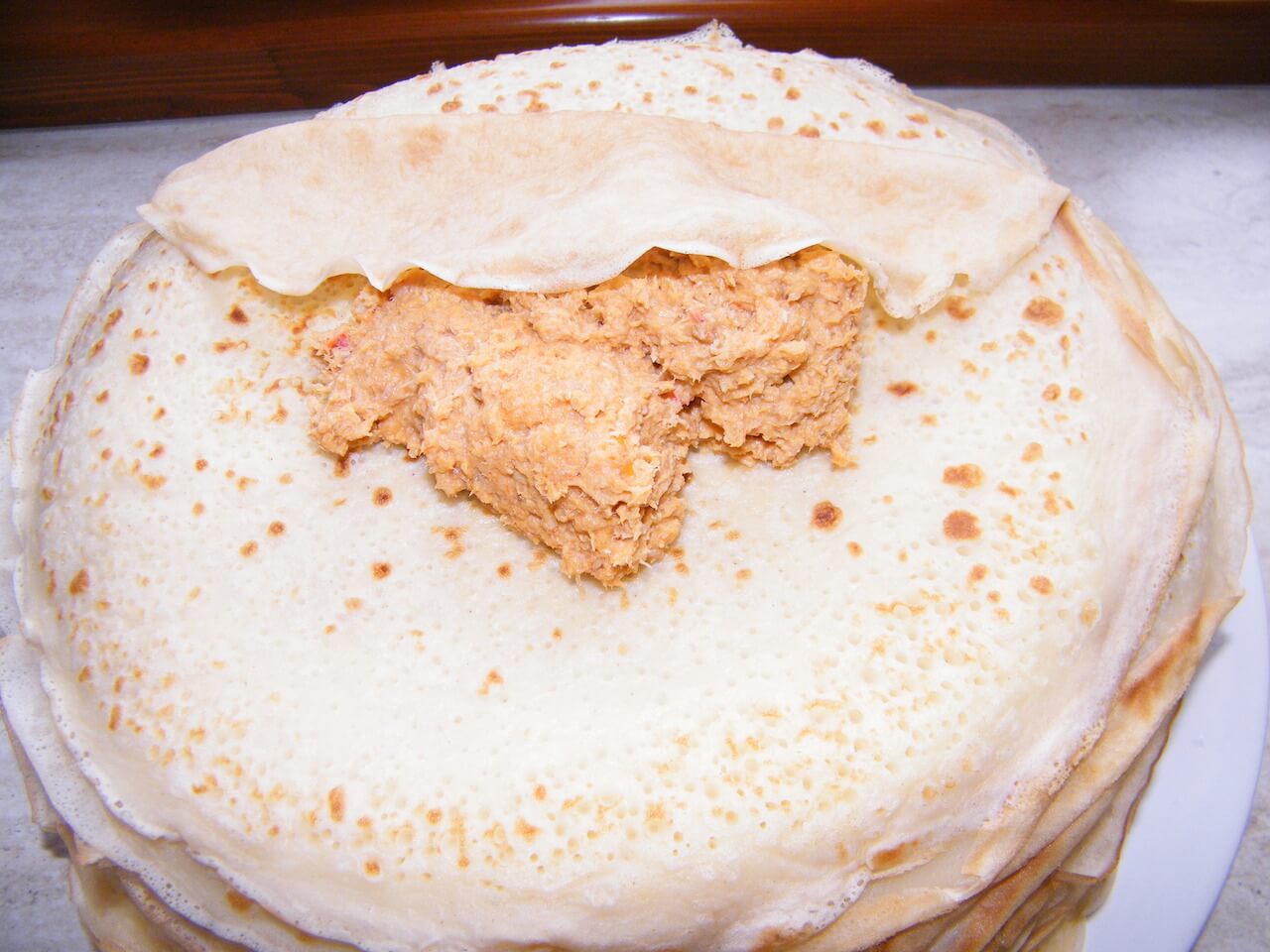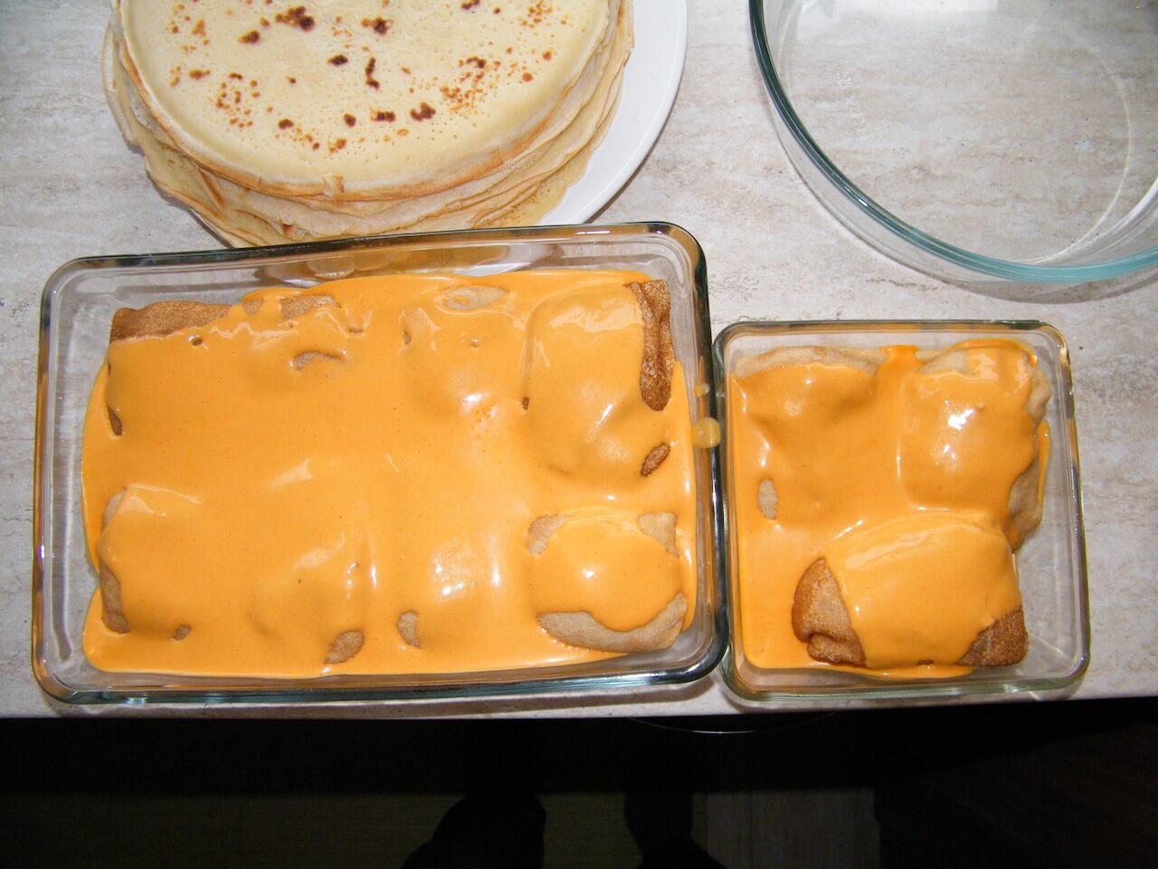 A fent megadott töltelék mennyiséghez 8 db palacsintára van szükségünk, ehhez a palacsintához való mennyiségeknek csak az ötödét használjuk.