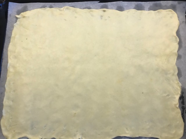 3 gombócra szedjük, majd akkorára nyújtjuk, mint a tepsink, amit sütőpapírral kibéleltünk.