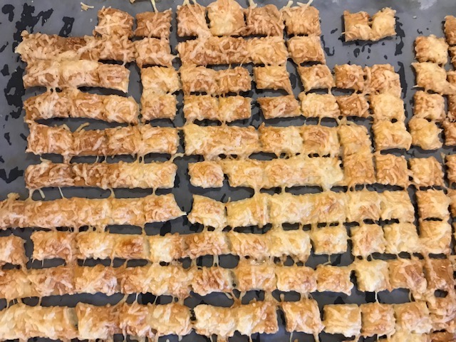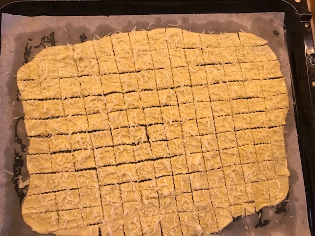 A kinyújtott tésztát megkenjük felvert tojással és megszórjuk reszelt sajttal, vagy bármivel. Derelyevágóval (vagy pizzaszeletővel) kis kockára felvágjuk.