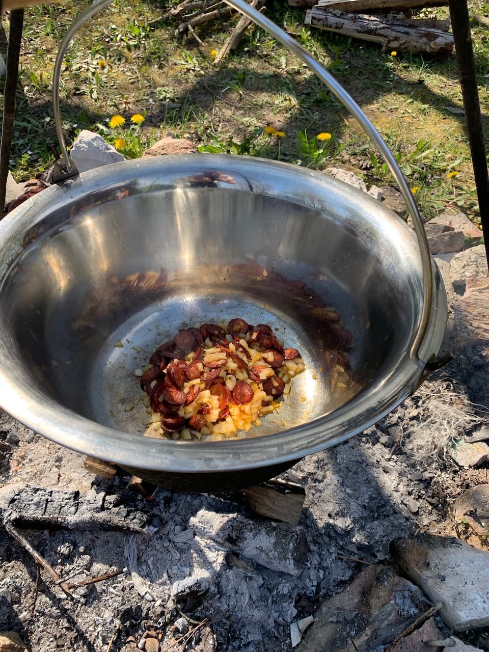 A zsírt felforrósítjuk, majd rádobjuk a felkarikázott kolbászt és jól megsütjük. Utána mehet rá a hagyma, 2-3 perc alatt üvegesre pároljuk, majd rádobjuk a fokhagymát is.