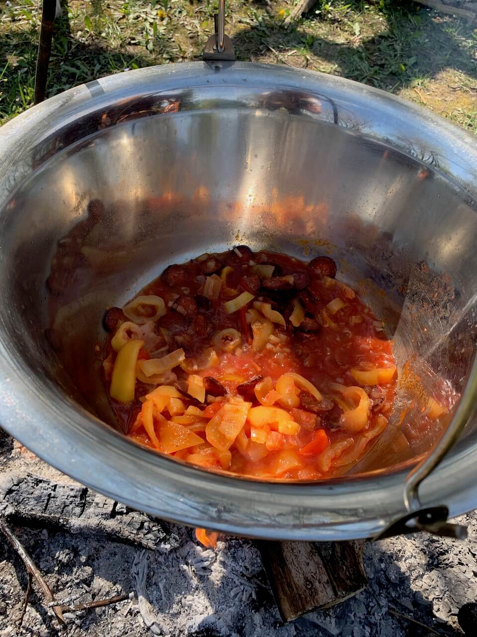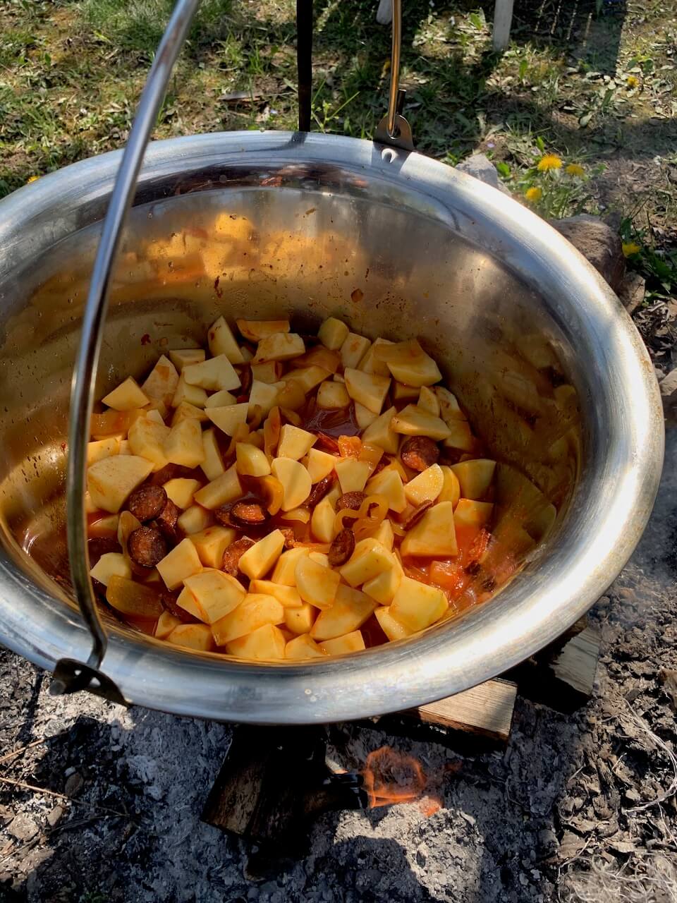Amíg felforr mehet nagyobb lángon, aztán hagyjuk csendesen főddögélni, amíg a krumpli teljesen megpuhul. Sőt, én úgy szeretem, amikor a krumpli már kicsit kezd szétfőni. Útközben időnként megkeverjük és pótoljuk a vizet, ha kezd kiszáradni (ez most nem lett elég szaftos).
