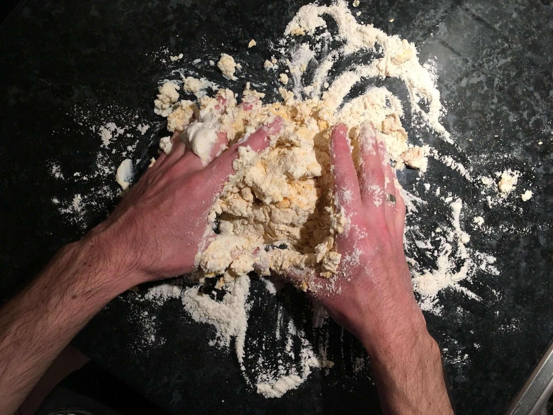 A hozzávalókat kézzel összedolgozzuk és néhány percig gyúrjuk, amíg egy rugalmas gombóc lesz belőle.