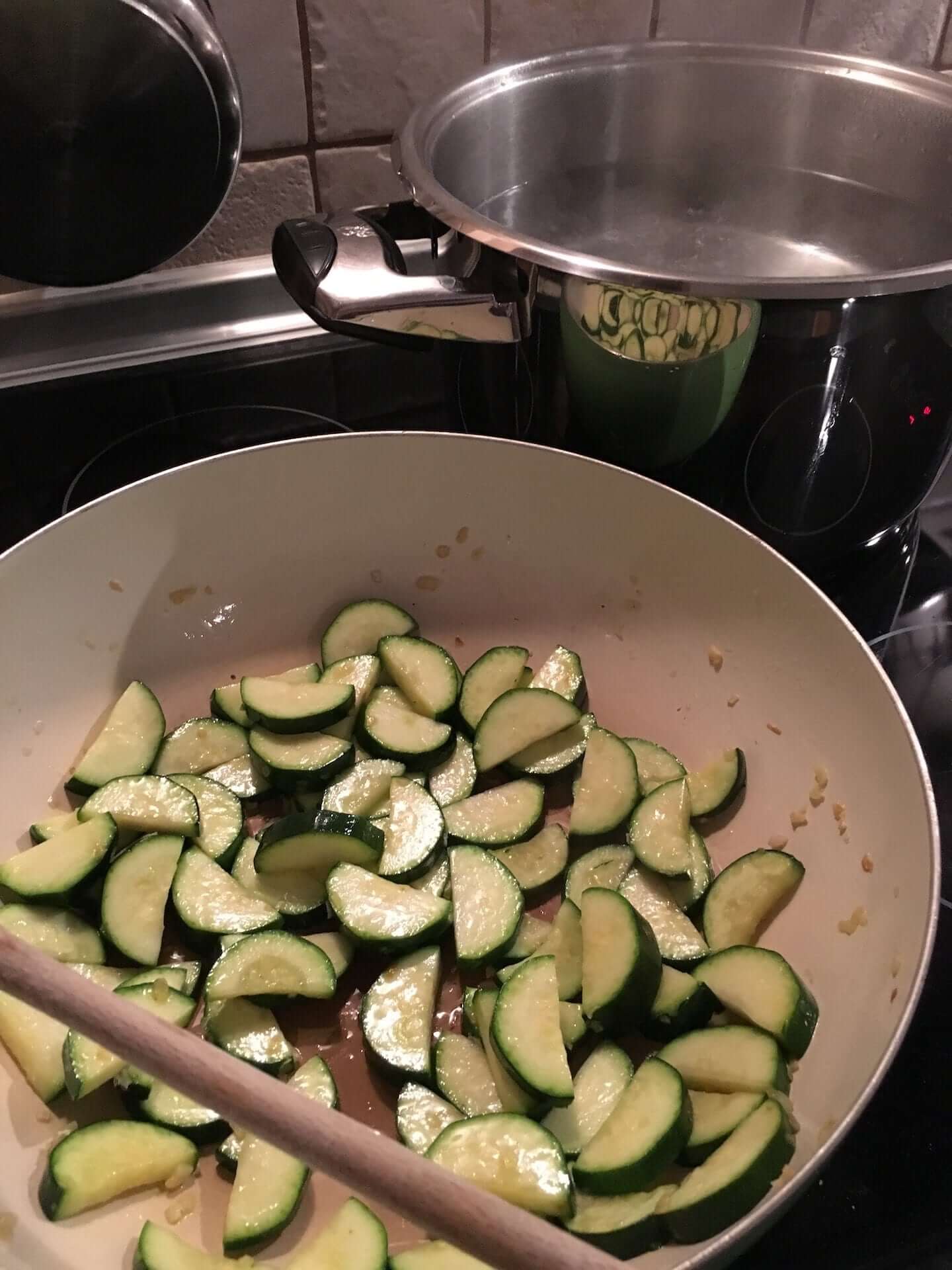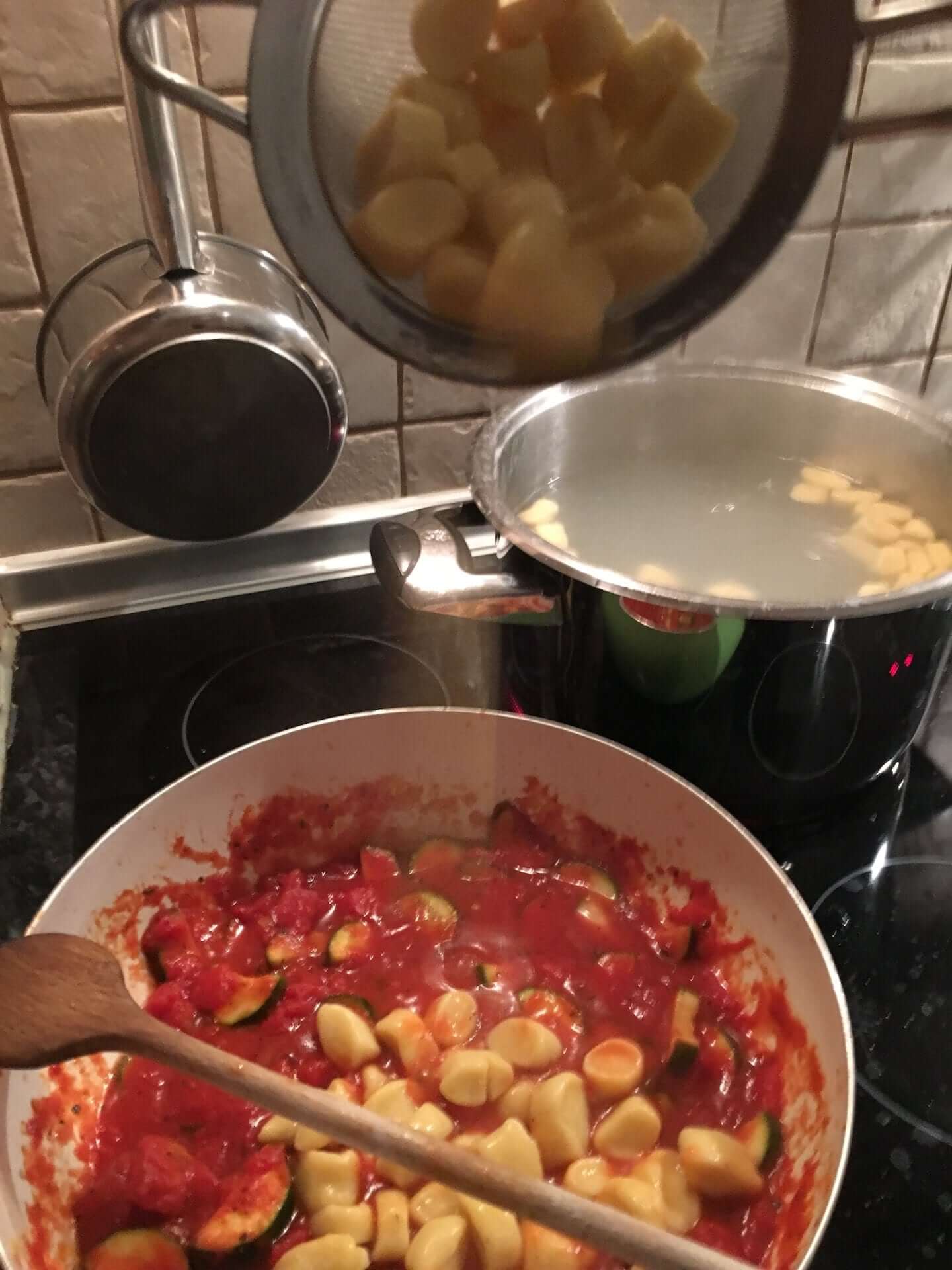 Olívaolajat forrósítunk, rádobjuk a fokhagymát (és a chilit). 1-2 perc után hozzáadjuk a cukkínit és 6-8 percig pároljuk. Ezután ráöntjük a paradicsomot, sózzuk, borsozzuk, bazsalikomot szórunk rá. Amíg a gnocci készül ez kis lángon rotyoghat (15-20 perc).