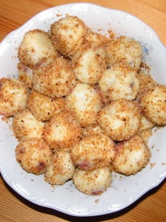 Mikor a gombócok feljönnek a víz színére, szűrővel egy pillanatra hideg vízbe tesszük őket, hogy edződjenek. Ezt követően azonnal egy másik tálba tesszük, ahol olvasztott zsírral locsoljuk meg őket, s finoman összerázzuk. A prézlit apró adagokban oszlatjuk el a gombócokon, közben mindig meg-megrázogatva, hömbölgetve őket a tálban. Az elkészült gombócokat porcukorral szórjuk, s melegen tálaljuk. A tészta másik felével ugyanígy járunk el, ill. készíthetünk belőle nudlit is.