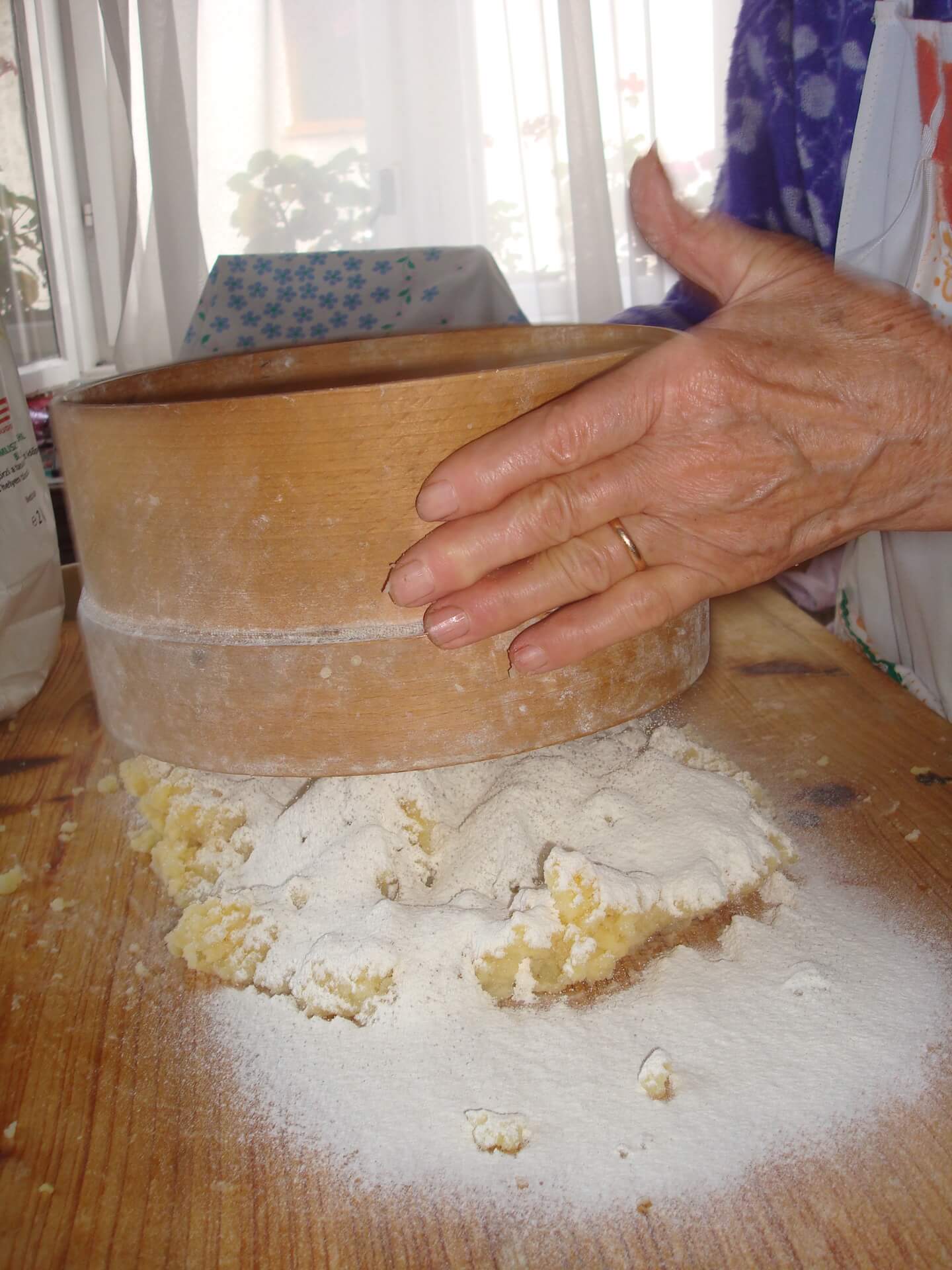 Nagy lábasban vizet teszünk fel forrni. A tésztát összekeverjük, röviden meggyúrjuk, kettéosztjuk. A gyúródeszkát és az első adag tészta felszínét lisztezzük, kb. fél centiméteres vastagságúra nyújt- juk (inkább vékonyabbra).