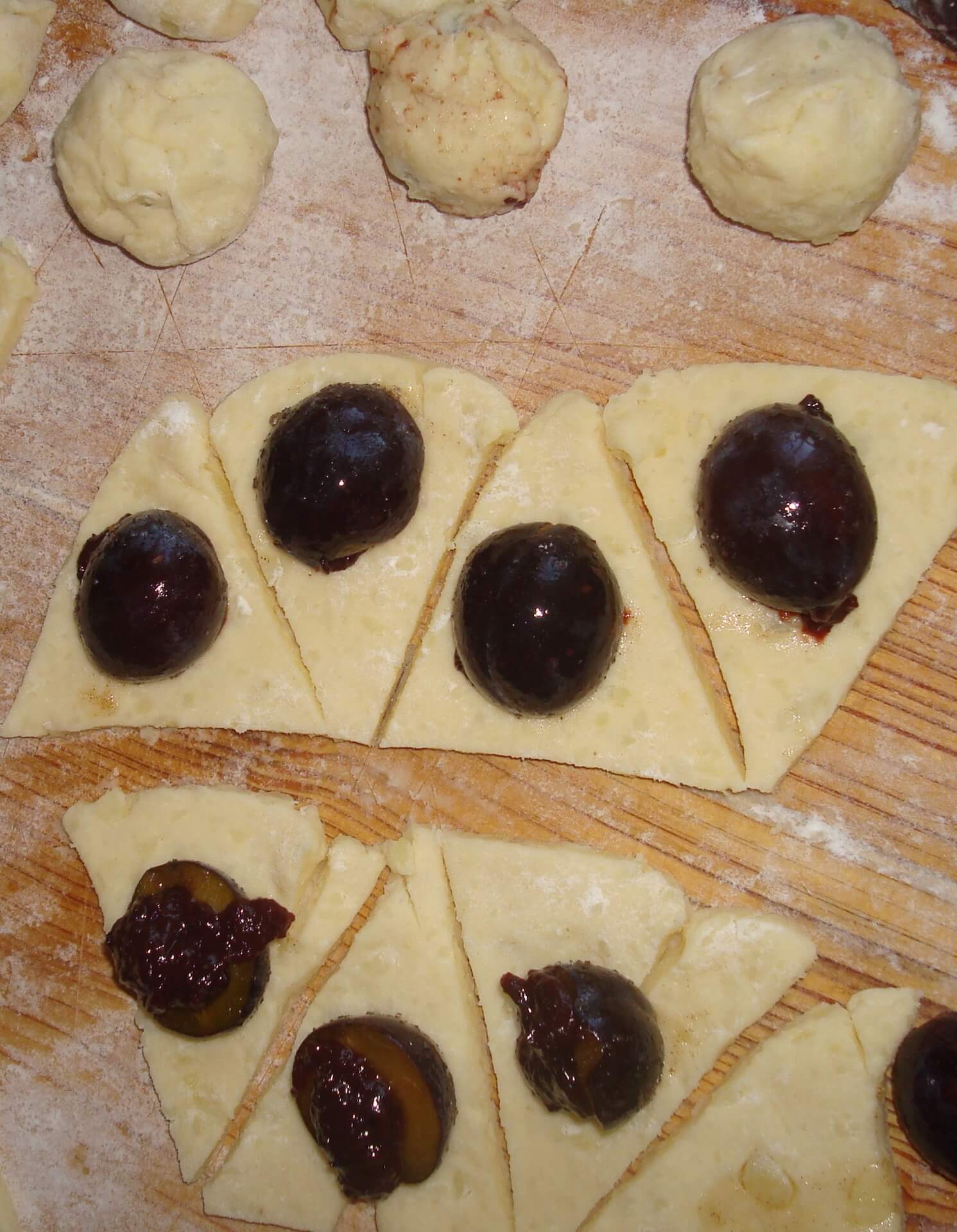 A tésztát egy-egy gombóc megformálásához elegendő nagyságú háromszögekre vágjuk (ahogy az ábrán látható), a háromszögekre helyezzük a félszilvákat, rájuk mokkáskanálnyi szilvalekvárt teszünk. Ezeket lefordítjuk a tésztára, a háromszög sarkait összenyomkodjuk, így gombócot képzünk. Liszttel meghintjük, újra gömbölygetjük, s azonnal a forrásban lévő vízbe helyezzük.