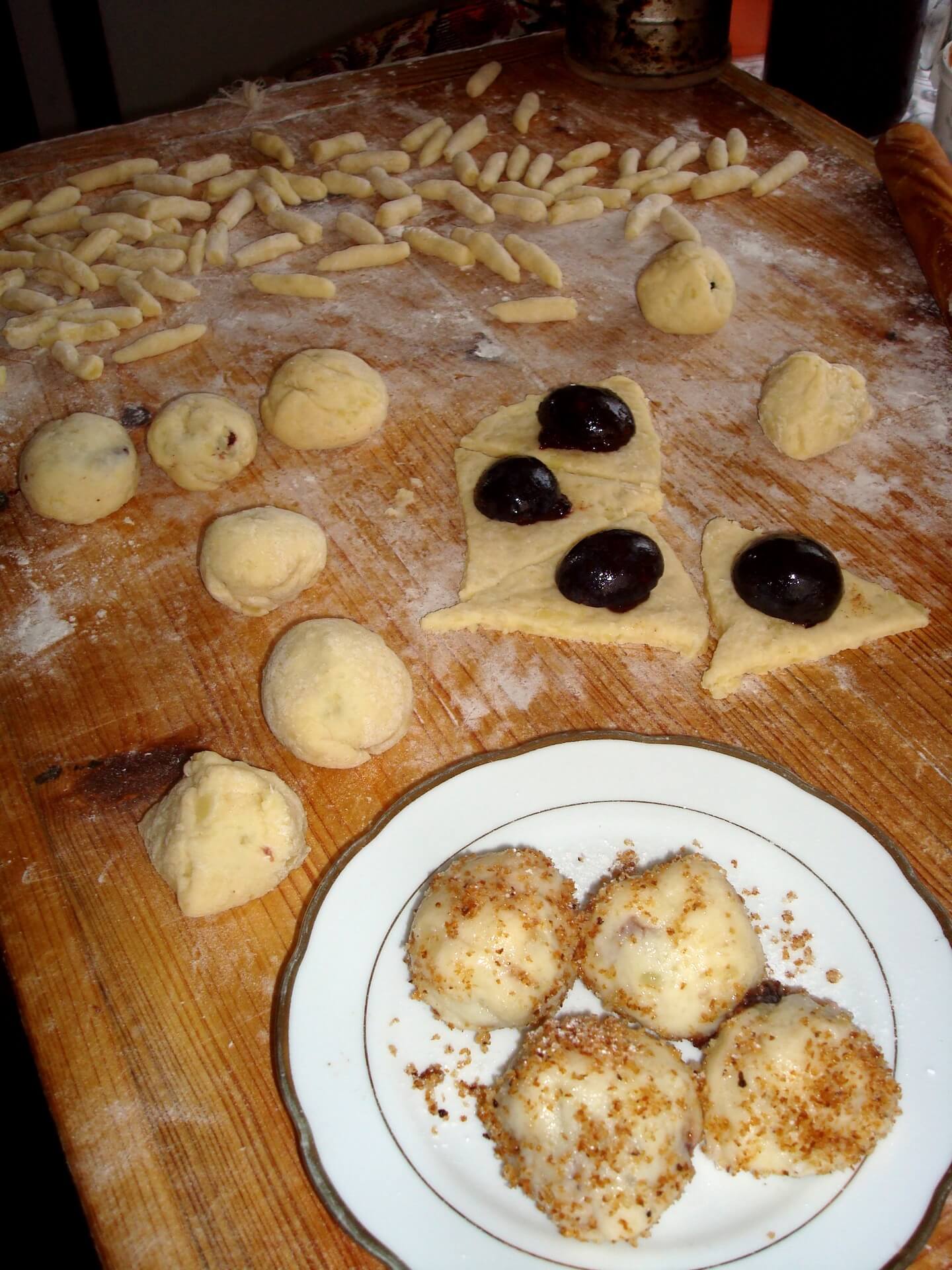 A szilvákat hosszanti irányban teljesen kettévágjuk, kimagozzuk, cukorral, fahéjjal szórjuk meg, finoman összekeverjük. A krump-lit héjában, vagy hámozva megfőzzük. Még melegen összetörjük, majd a már kihűlt krumplit étolajjal meglocsoljuk (kb. 4-6 evőkanál). Lisztet szitálunk rá (kb. 20-30 dkg), amennyit a tészta felvesz.