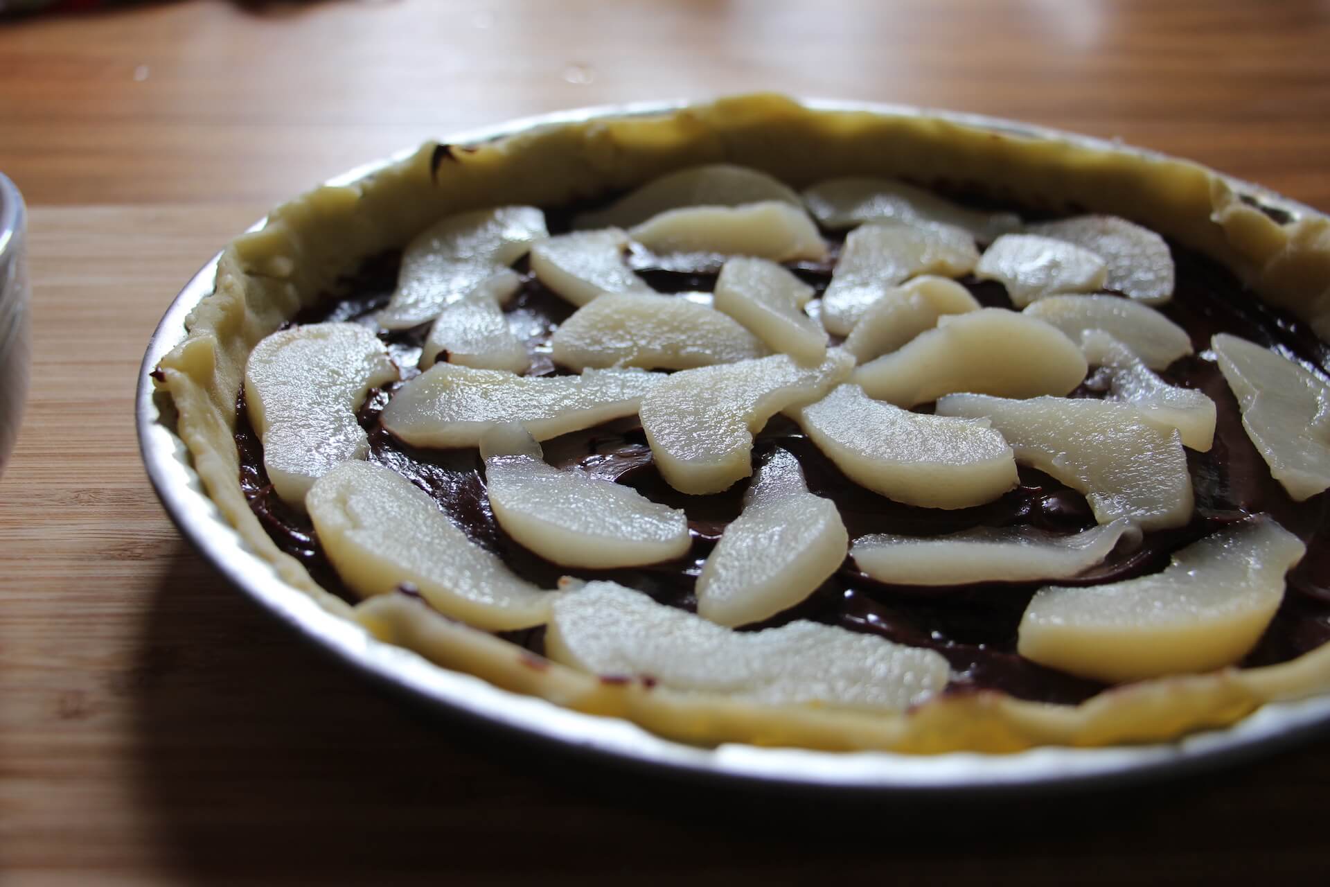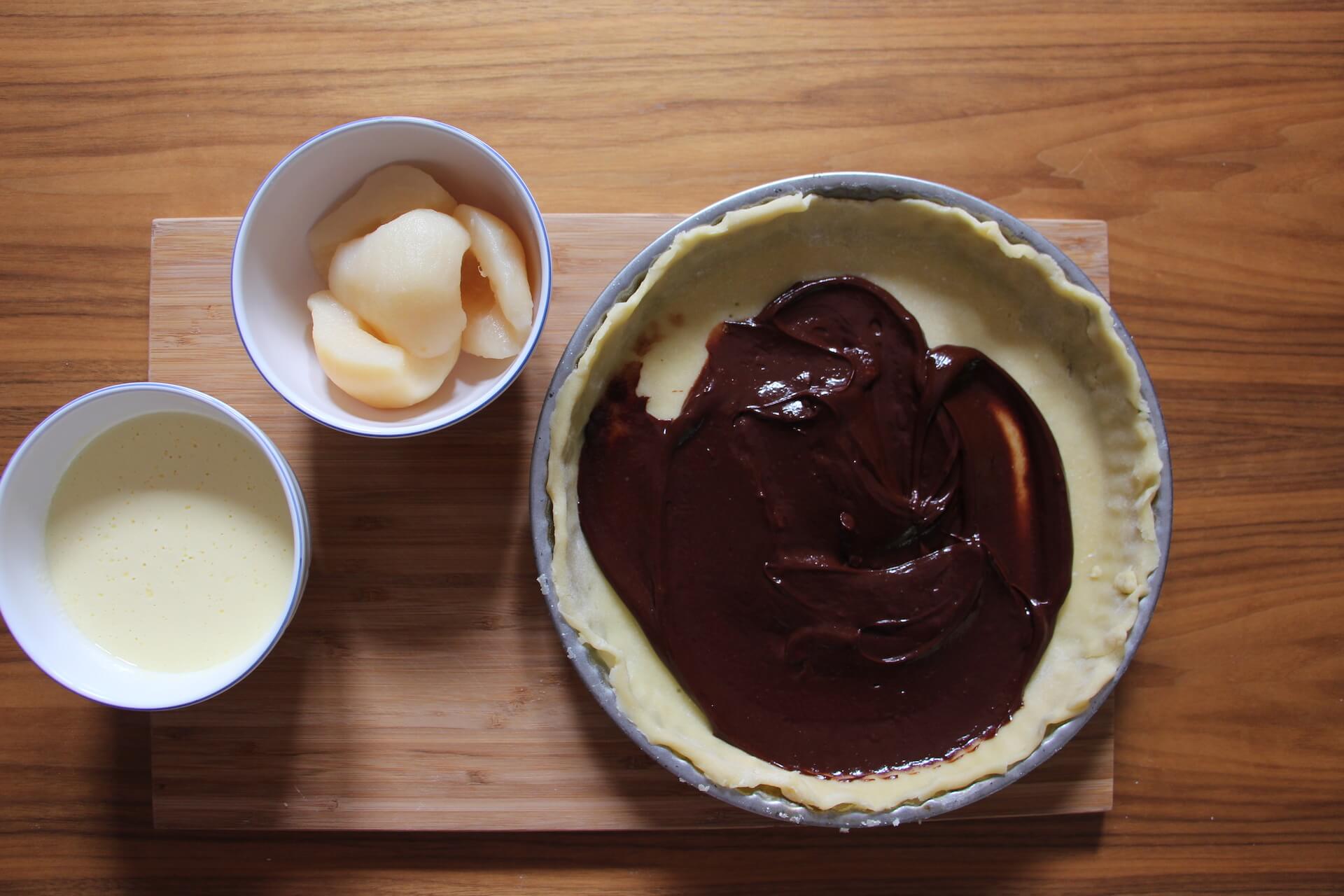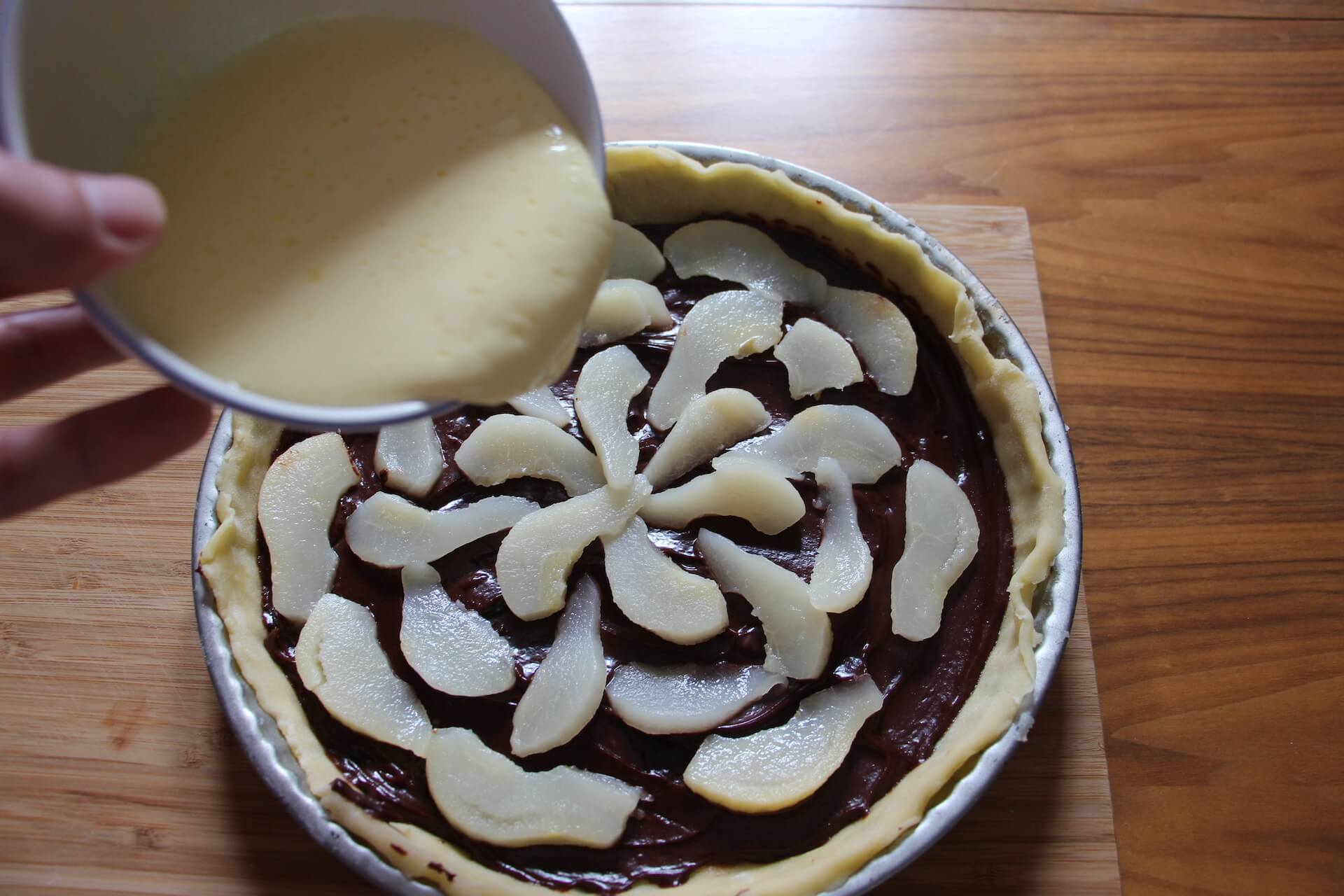 Az olvasztott csokihoz hozzákeverünk kb. fél doboz tejfölt és az egészet rákenjük a tésztára. Ezután a vékonyra felcikkezett körtét elosztjuk a csokirétegen és az egészet befedjük a maradék tejfölből, 2 tojásból és 1 zacskó vaníliáscukorból álló keverékkel. 180 °C fokos sütőben kb. 30-40 perc alatt sül meg.